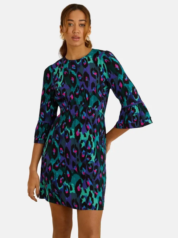 Design: Trompetmouwen; Materiaal: Jersey; Halstype: Ronde hals; Motief: Dierenprint; Details: Volant, Gedrapeerd; Extra's: All-over patroon; Lengte: Kort/mini; Pasvorm: Normale pasvorm; Armlengte: Driekwart mouw