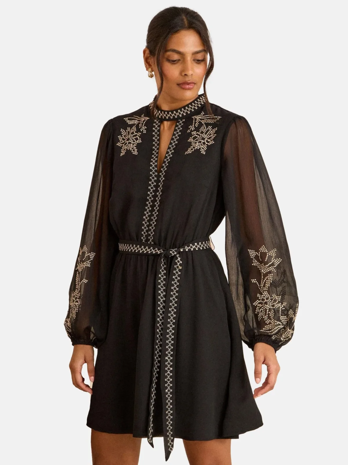 Design: Pofmouwen, Tailleriem; Halstype: Opstaande kraag; Details: Borduursels, Gedrapeerd; Extra's: Licht transparant, Op staal naden; Lengte: Kort/mini; Snit: Getailleerd; Pasvorm: Normale pasvorm; Armlengte: Lange mouw