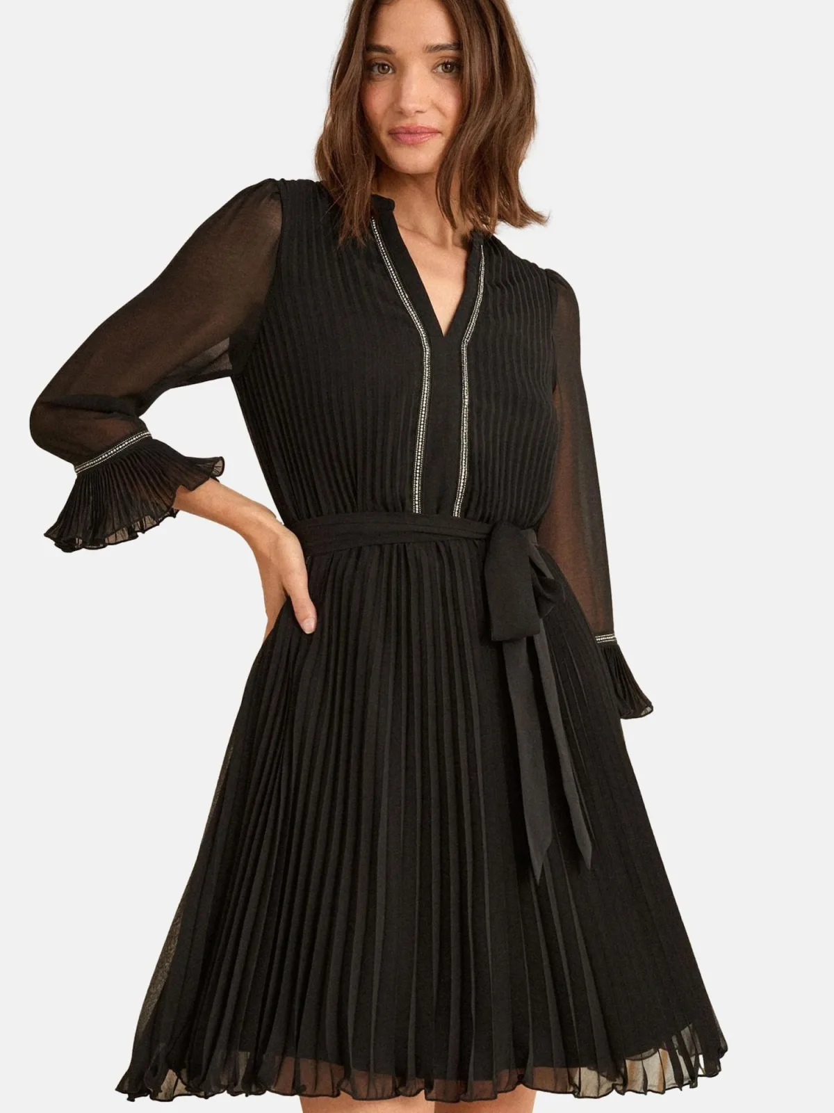 Design: Gevoerde zoom/rand, Rechte zoom, Tailleriem; Type sluiting: Ritssluiting; Halstype: V-hals; Details: Sierstenen, Plissé; Extra's: Op staal naden, Gladde stof; Lengte: Kort/mini; Snit: Getailleerd; Pasvorm: Normale pasvorm; Armlengte: Driekwart mouw