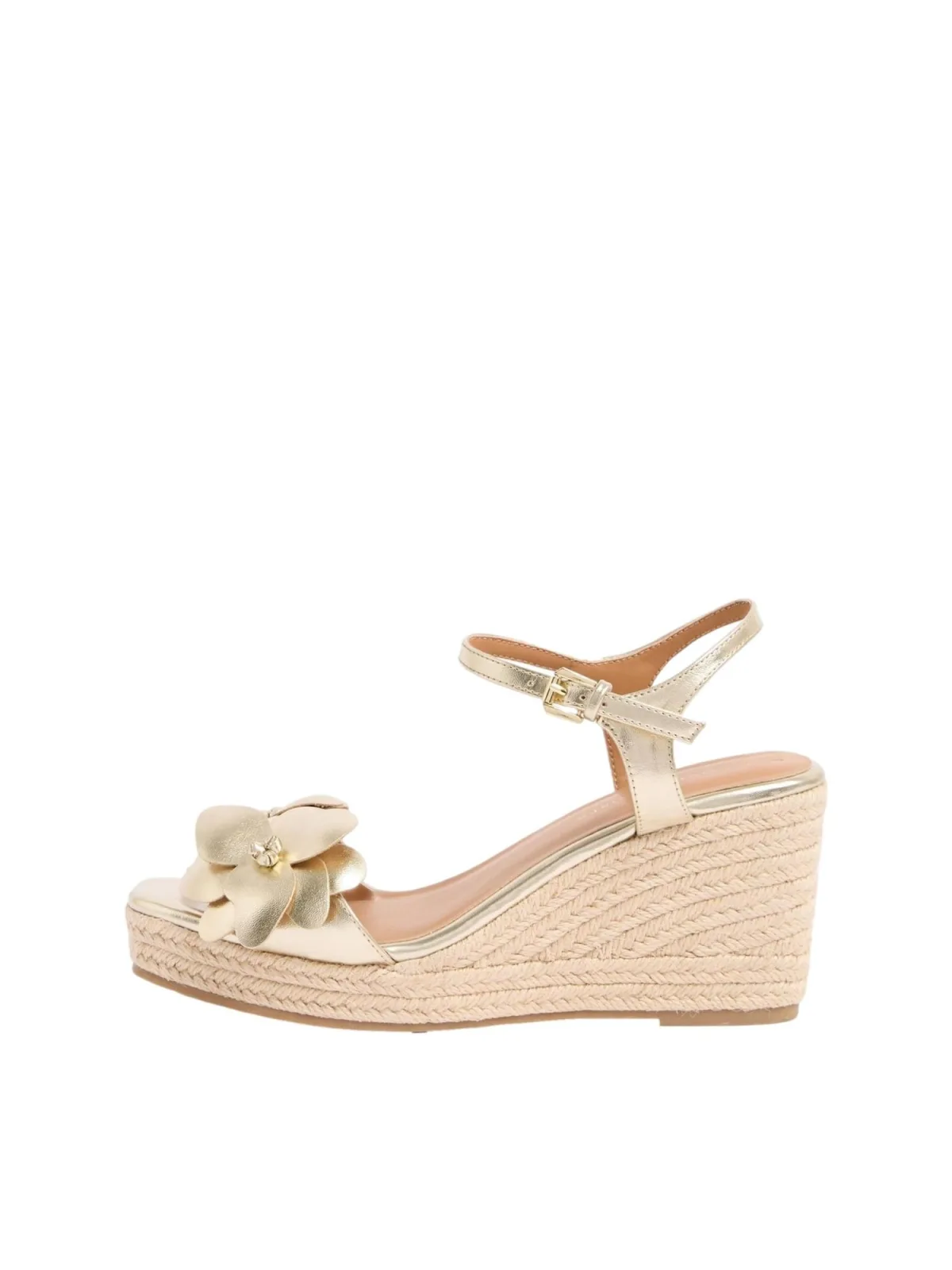 Design: Hak/zool met raffia-look; Type sluiting: Riemsluiting; Type hak: Sleehak; Materiaal: Imitatieleder; Motief: Effen; Plateau: Met plateau; Materiaal: Imitatieleer; Schoenneus: Open toe; Extra's: Applicaties, Metallic look; Hakhoogte: Hoge hak (7-10 cm)