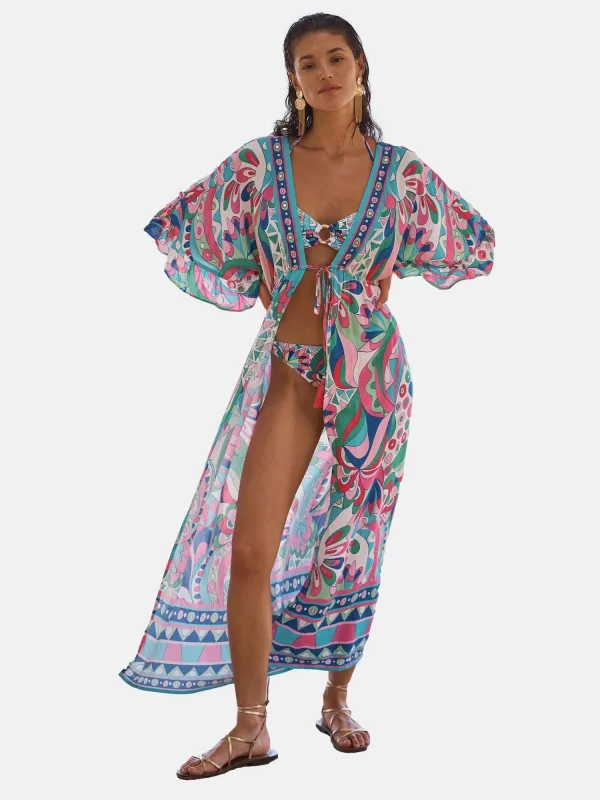 Design: Gevoerde zoom/rand, Om te knopen/binden; Materiaal: Viscose; Details: Gedrapeerd; Extra's: All-over patroon, Gladde stof; Lengte: Lang/maxi; Snit: Getailleerd; Pasvorm: Normale pasvorm; Armlengte: Halve mouw