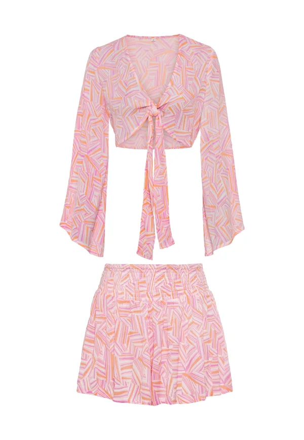 Blouse type: Klassieke blouse; Voering: Niet gevoerd; Materiaal: Viscose; Halstype: V-hals; Motief: Aztec print; Kraag: Tuniek kraag; Soort bandjes: Normale bandjes; Details: Gedrapeerd; Aantal per set: 2-delig; Lengte: Kort/mini; Pasvorm: Normale pasvorm; Armlengte: Lange mouw; Lengte: Normale lengte