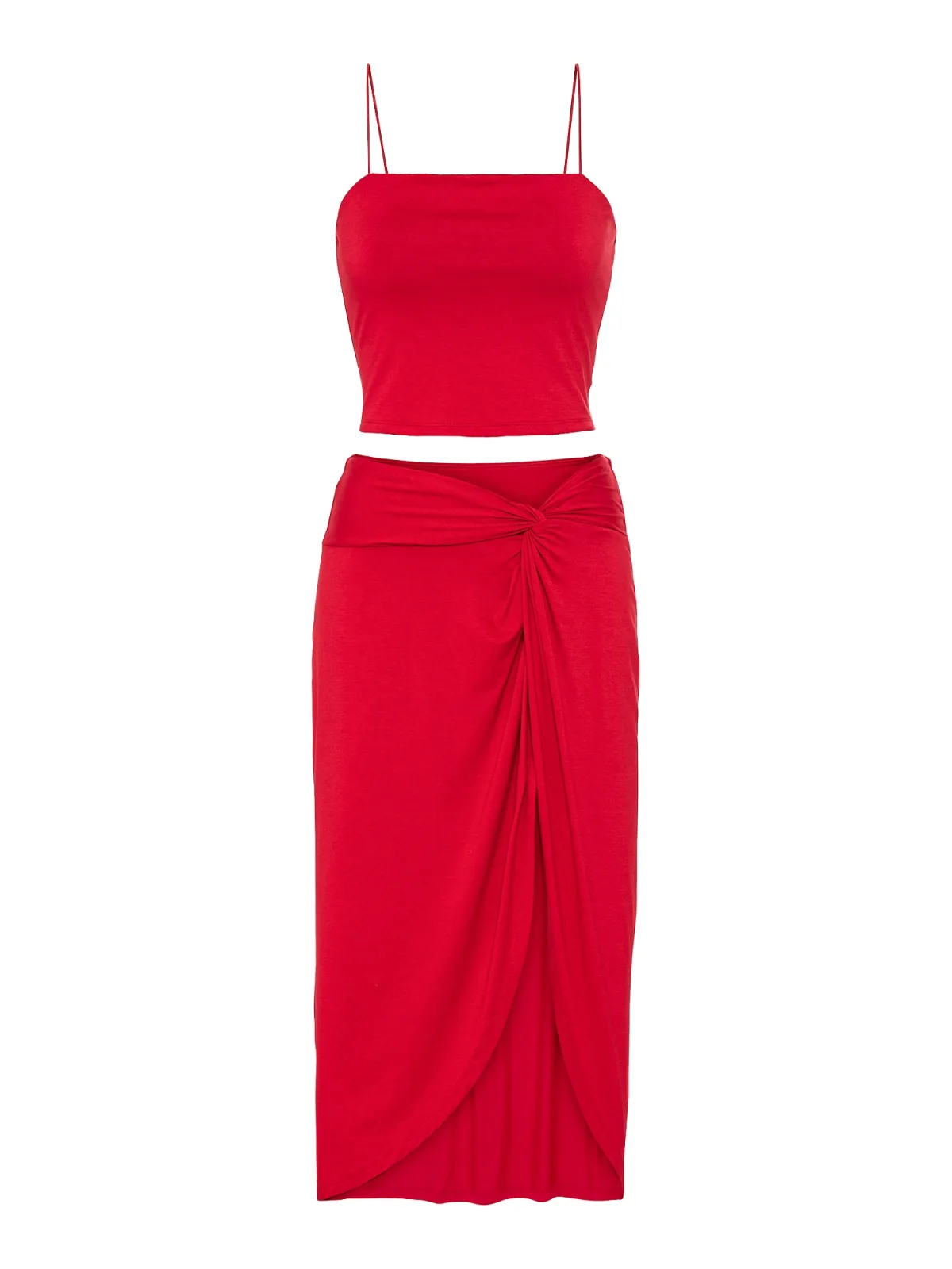 Design: Gevoerde zoom/rand, Overige kragen; Voering: Niet gevoerd; Materiaal: Jersey; Halstype: Carréhals; Motief: Effen; Kraag: Zonder kraag; Soort bandjes: Spaghettibandjes; Details: Plooien; Extra's: Op staal naden, Lichte stof; Aantal per set: 2-delig; Lengte: 3/4 lengte; Pasvorm: Slanke pasvorm; Armlengte: Mouwloos; Lengte: Korte pasvorm