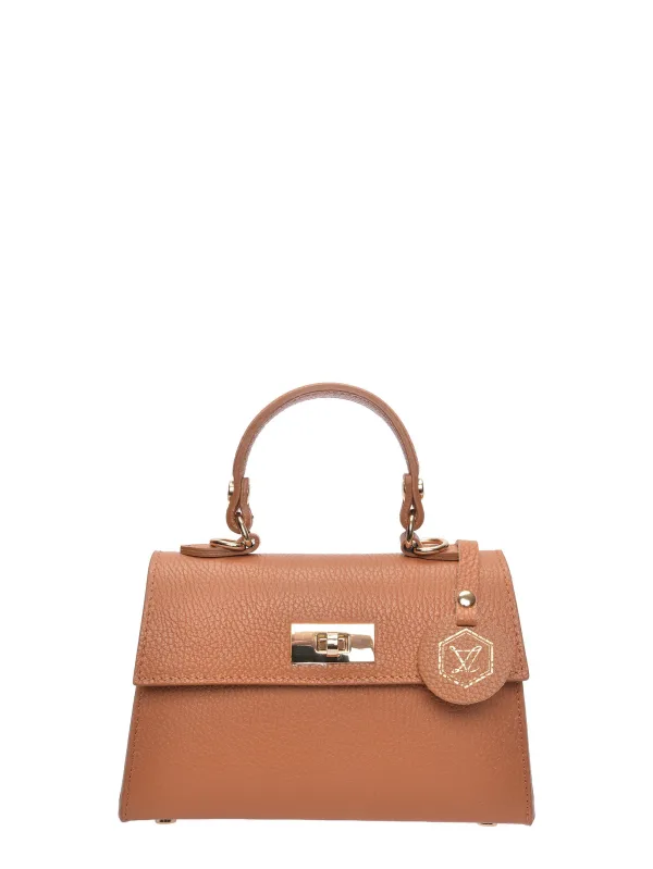 Handtas 100% koeienleer Voorflap met draaivergrendeling Interne ritszak en slipzak Afmetingen: 12,5 x 19,5 x 7,5 cm Handvat: 21 cm Schouderriem: 120 cm verstelbaar