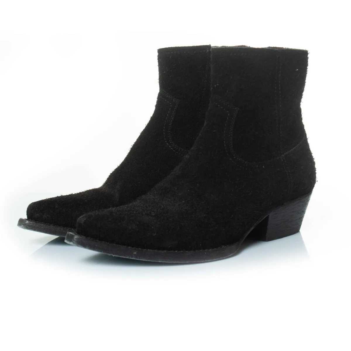 VINTAGE, RRP ALS NIEUW Saint Laurent, Lukas leren suède enkellaarsjes in zwart. Het item is in zeer goede staat en wordt geleverd met een stofzak. CONDITIE: zeer goede staat MAAT: 36 BINNENZOFTIE GEHEEL: 24 cm HIELMAAT: 4 cm PLATFORM: 1 cm SCHOENHOOGTE: 13 cm BREEDTE ENKEL: 10 cm MATERIAAL: wollen suède KLEUR: zwart