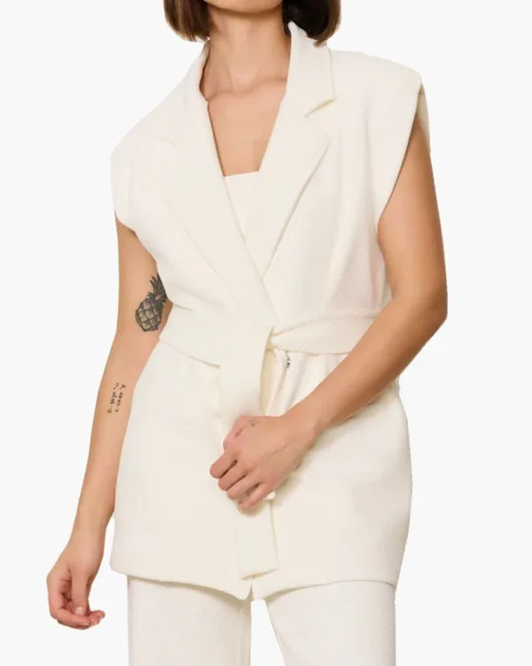 Mouwloze blazer voor dames Moon Classic Blazer uit de collectie van Lune Active. Dit model is gemaakt van 52% biologisch katoen in combinatie met 46% gerecycled polyester en 2% elastaan in een gebroken witte tint. De blazer heeft een klassieke reverskraag en sluit met drukkers aan de voorzijde. Een bijpassende stoffen riem die je rond de
