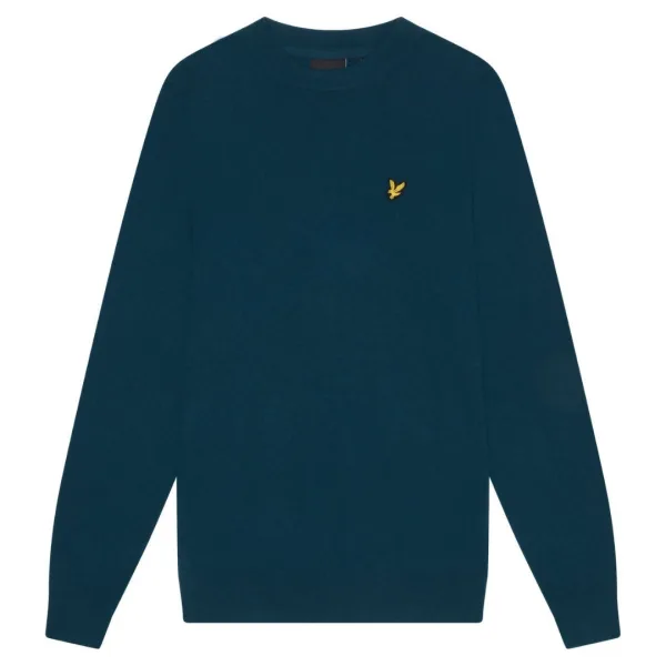 Lyle & Scott blauwe trui, 100% katoen, kleine merkbadge op de linkerborst, gemaakt in Bangladesh, blauwe trui met ronde hals