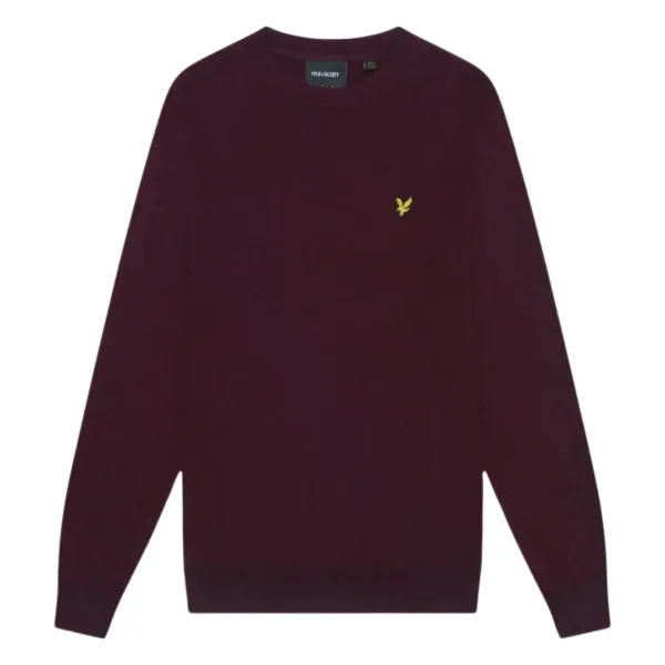 Lyle & Scott bordeauxrode trui, 100% katoen, kleine merkbadge op de linkerborst, gemaakt in Bangladesh, rode trui met ronde hals