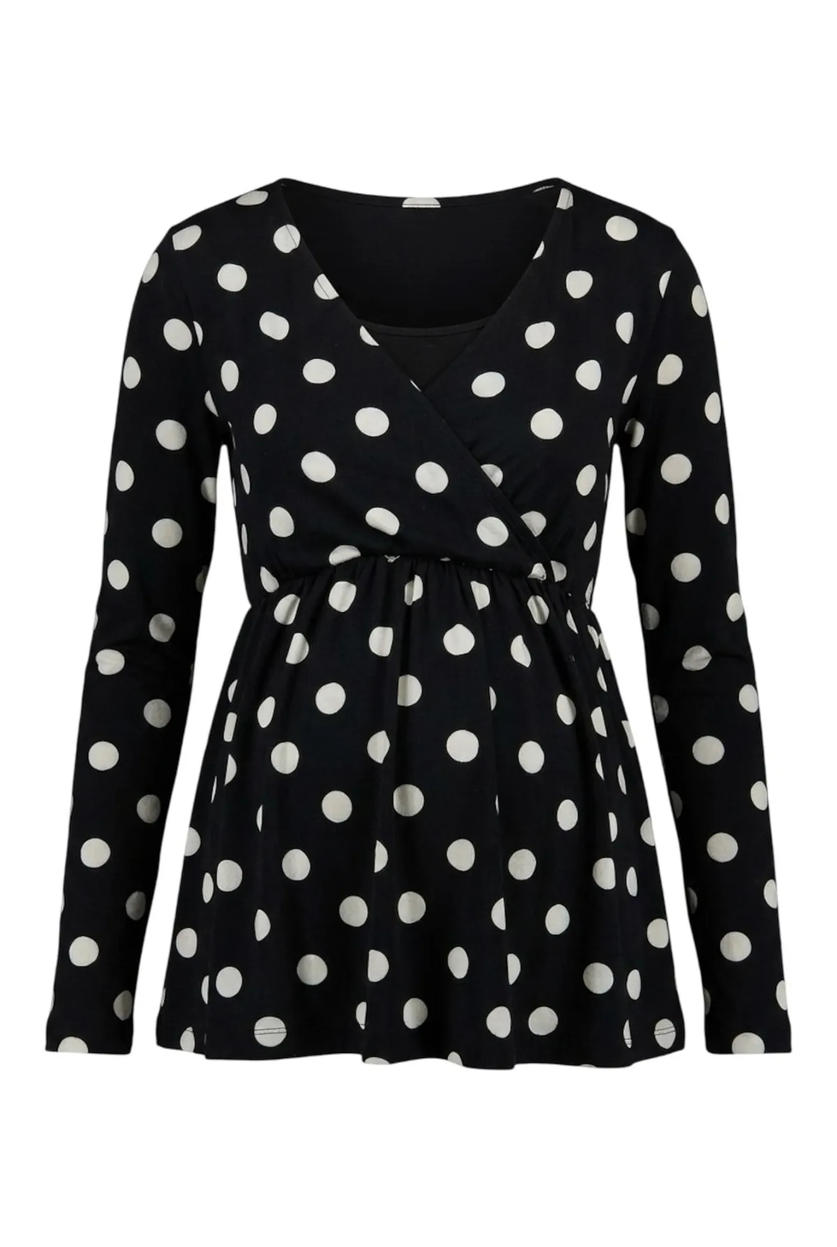 Blouse type: Blouseshirt; Design: Gevoerde zoom/rand, Getailleerd model; Motief: Gestippeld; Kraag: Zonder kraag; Details: Gedrapeerd, Wikkel design; Extra's: All-over patroon; Pasvorm: Normale pasvorm; Armlengte: Lange mouw; Lengte: Normale lengte