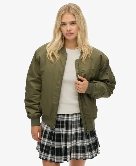 Ruimvallende pasvorm - los en flexibel voor wanneer je beweegruimte nodig hebt Ritssluiting, ribboorden en gewatteerde binnenvoering Drie buitenzakken met drukknopen met merklogo Kenmerkend metalen label op de mouw Het MA1-bomberjack is echte klassieker, speciaal verfijnd voor jouw kenmerkende stijl. De kenmerkende metalen badge op de mouw, de ruime pasvorm en de drukknopen met merklogo maken het gemakkelijk om een edgy vibe aan je outfits te geven, naast premium comfort en stijl.