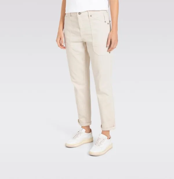 Dames BROEK van MAC;Elastische katoenmix;Slim Fit;Model 'Iowa';Opgestikte zakken;Achterzakken;Knoop- en ritssluiting;Bandwijdte bij maat 36: 39 cm;Binnenbeenlengte bij maat 36: 72 cm