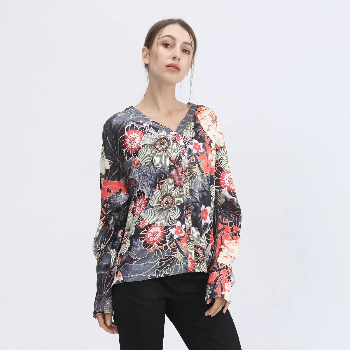Macro -bloemenprint en v -nekblouse
