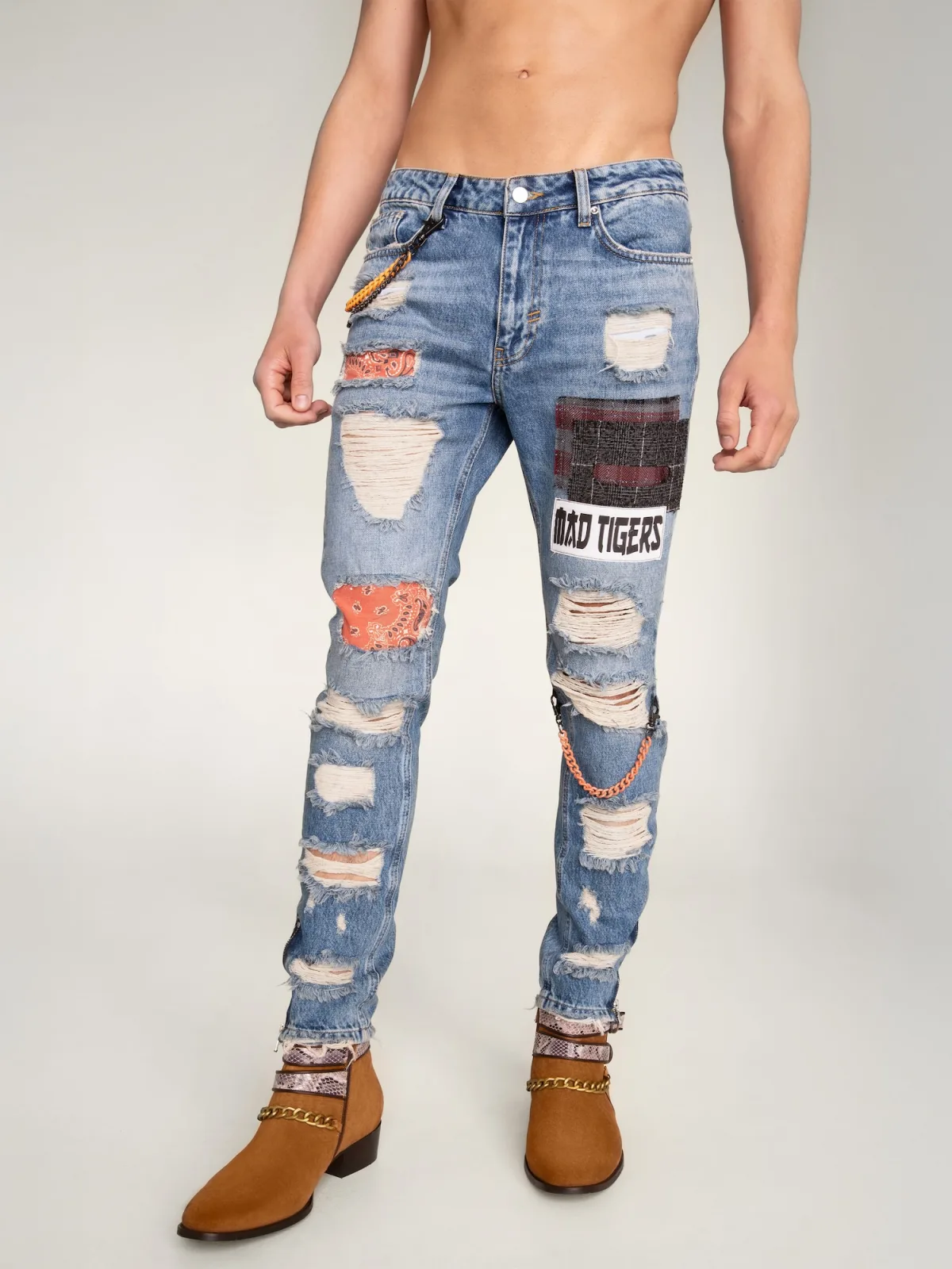 MAD TIGERS Jeans ‘CHE-CHAINS ARTPATCH’ lichtblauw