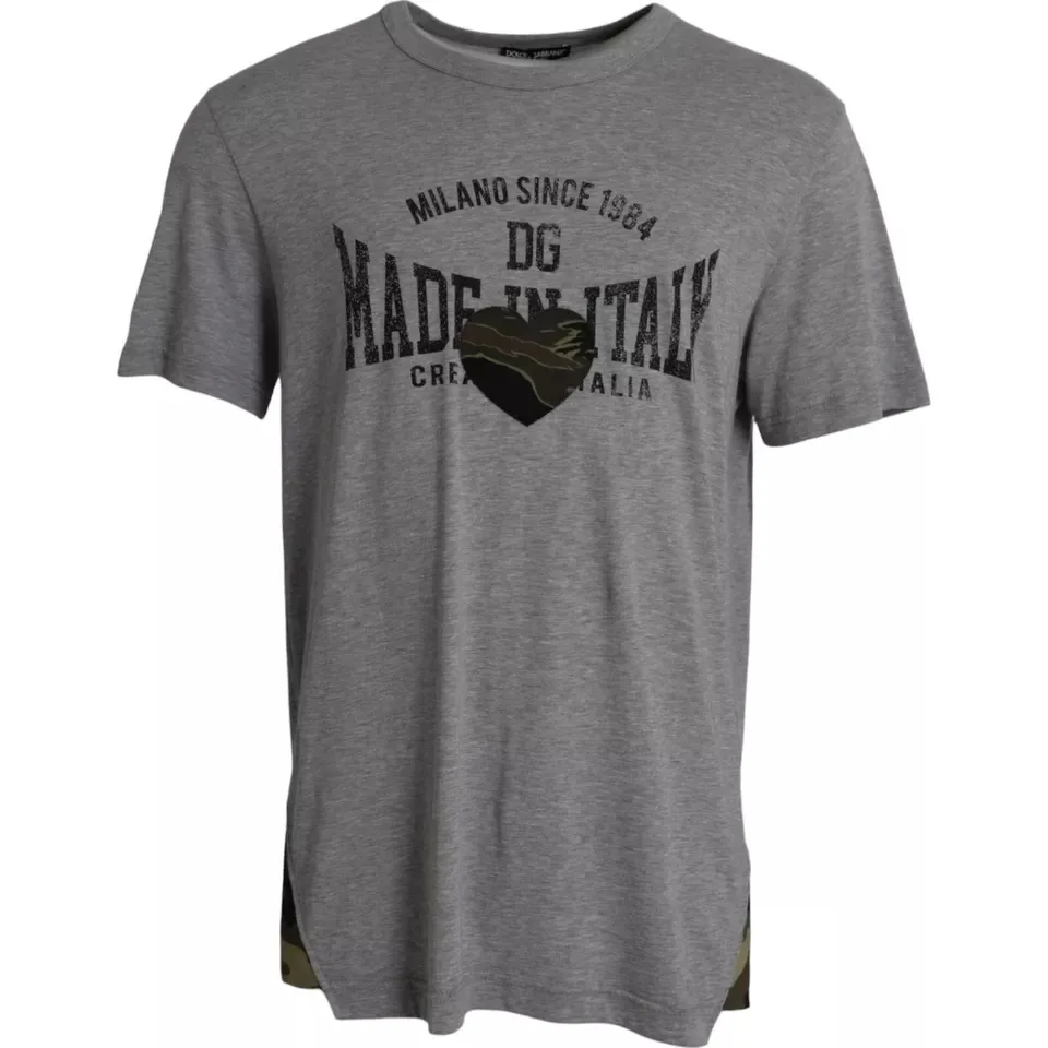 Verhoog je stijl. Omarm Italiaanse ambacht. Dit Dolce & Gabbana T-shirt biedt moeiteloze verfijning en comfort de hele dag door. De comfortabele katoenmix en het onderhoudsvriendelijke ontwerp maken het een basisstuk in je garderobe. Val op met de onderscheidende 'Made in Italy' graphic, compleet met een camouflage hartdetail. Geniet van een ruime, natuurlijke pasvorm die je casual stijl aanvult. Ervaar de perfecte combinatie van duurzaamheid en eenvoudig onderhoud. Ideaal voor dagelijks gebruik, voegt dit T-shirt een vleugje luxe toe aan elke outfit.