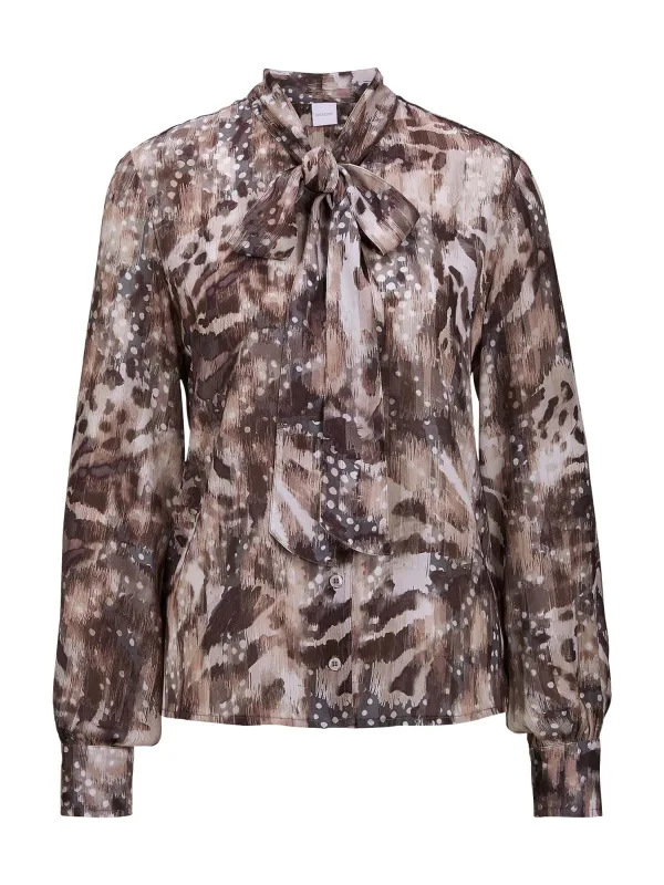 Blouse type: Klassieke blouse; Design: Om te knopen/binden; Type sluiting: Knoopsluiting; Kraag: Strik; Extra's: All-over patroon; Pasvorm: Normale pasvorm; Armlengte: Lange mouw; Lengte: Normale lengte