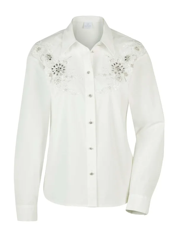 Blouse type: Klassieke blouse; Design: 1-knoops manchetten, Ronde zoom; Type sluiting: Knoopsluiting; Materiaal: Katoen; Motief: Bloemenprint; Kraag: Kentkraag; Details: Kant, Sierstenen; Extra's: Glitterend; Pasvorm: Normale pasvorm; Armlengte: Lange mouw; Lengte: Normale lengte