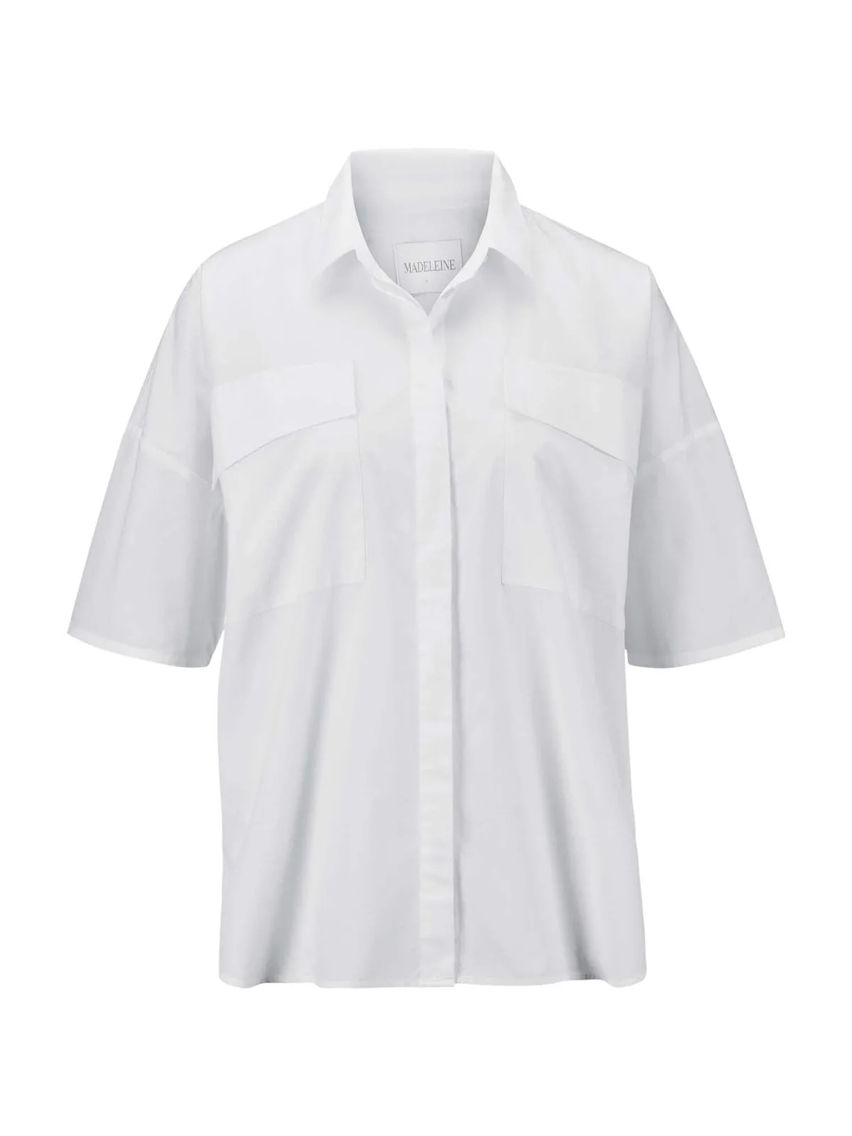 Blouse type: Klassieke blouse; Design: Borstzak; Type sluiting: Knoopsluiting; Materiaal: Katoen; Motief: Effen; Kraag: Kentkraag; Extra's: Voelt zacht aan; Pasvorm: Wijde pasvorm; Armlengte: Halve mouw; Lengte: Normale lengte