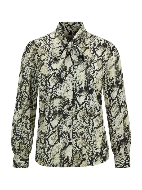 Blouse type: Blouseshirt; Design: 1-knoops manchetten, Knop placket, Om te knopen/binden; Type sluiting: Knoopsluiting; Motief: Dierenprint; Kraag: Opstaande kraag; Details: Plooien; Extra's: All-over patroon, Gladde stof; Pasvorm: Aansluitende pasvorm; Armlengte: Lange mouw; Lengte: Normale lengte