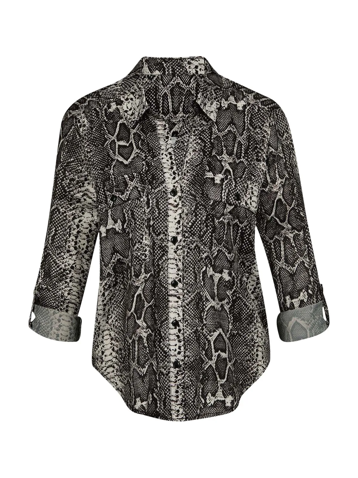 Blouse type: Klassieke blouse; Design: Gevoerde zoom/rand; Type sluiting: Knoopsluiting; Motief: Dierenprint; Kraag: Kentkraag; Details: Plooien; Extra's: Applicaties; Pasvorm: Normale pasvorm; Armlengte: Lange mouw; Lengte: Normale lengte