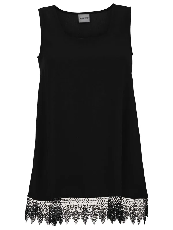 Blouse type: Blouseshirt; Design: Zoom/rand met boord; Type sluiting: Open; Motief: Effen; Kraag: Zonder kraag; Details: Kant; Extra's: Gladde stof; Pasvorm: Losse pasvorm; Armlengte: Mouwloos; Lengte: Normale lengte