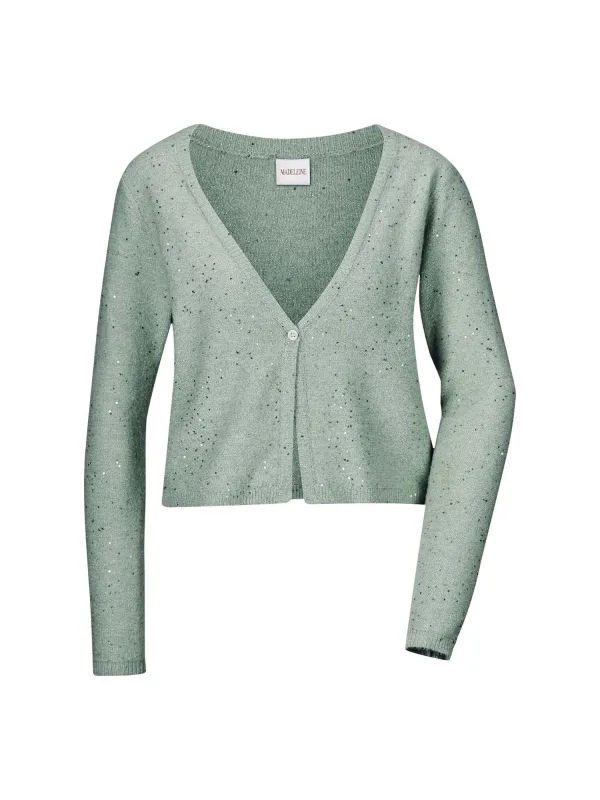 Design: Rechte zoom, Geribd ceintuurtje; Type sluiting: Knoopsluiting; Materiaal: Knitwear; Halstype: V-hals; Details: Pailletten; Extra's: Fully fashioned, Voelt zacht aan; Pasvorm: Normale pasvorm; Armlengte: Lange mouw; Lengte: Korte pasvorm