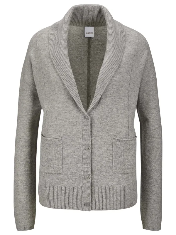 Design: Opgezette zakken; Type sluiting: Knoopsluiting; Materiaal: Knitwear; Halstype: Sjaalkraag; Motief: Mélange; Extra's: Voelt zacht aan; Pasvorm: Normale pasvorm; Armlengte: Lange mouw; Lengte: Normale lengte