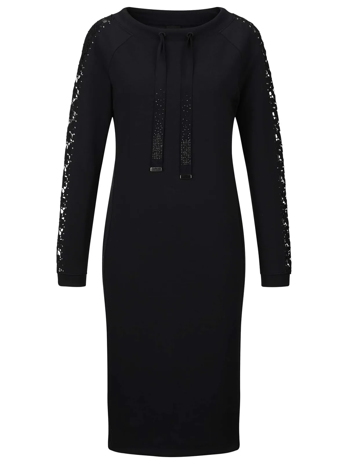 Design: Rechte zoom; Type sluiting: Open; Materiaal: Sweatstof; Halstype: Ronde hals; Motief: Effen; Details: Kant, Sierstenen; Extra's: Op staal naden; Lengte: Knielengte; Snit: Recht; Pasvorm: Normale pasvorm; Armlengte: Lange mouw