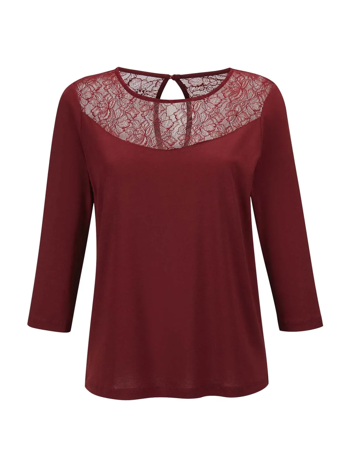 Design: Keyholesluiting; Type sluiting: Knoopsluiting; Materiaal: Jersey; Halstype: Boothals; Motief: Effen; Details: Cut-outs, Kant; Extra's: Licht transparant, Voelt zacht aan; Pasvorm: Normale pasvorm; Armlengte: Driekwart mouw; Lengte: Normale lengte