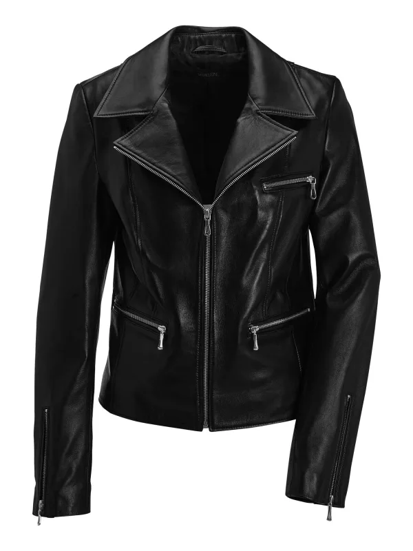 Design: Revers kraag, Borstzak, Ritszakken aan de zijkant; Type sluiting: Open; Type jas: Bikerjack; Voering: Licht gevoerd; Materiaal: Leer; Motief: Effen; Extra's: Op staal naden; Pasvorm: Normale pasvorm