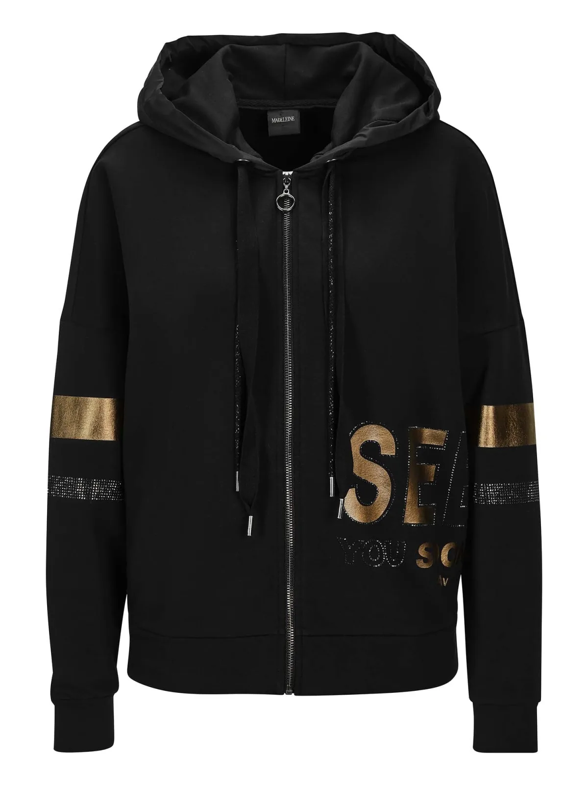 Design: Capuchon met trekkoord, Geribd ceintuurtje; Type sluiting: Ritssluiting; Voering: Niet gevoerd; Materiaal: Katoen; Motief: Tekst print; Extra's: Op staal naden, Omkeerbare pailletten; Pasvorm: Normale pasvorm