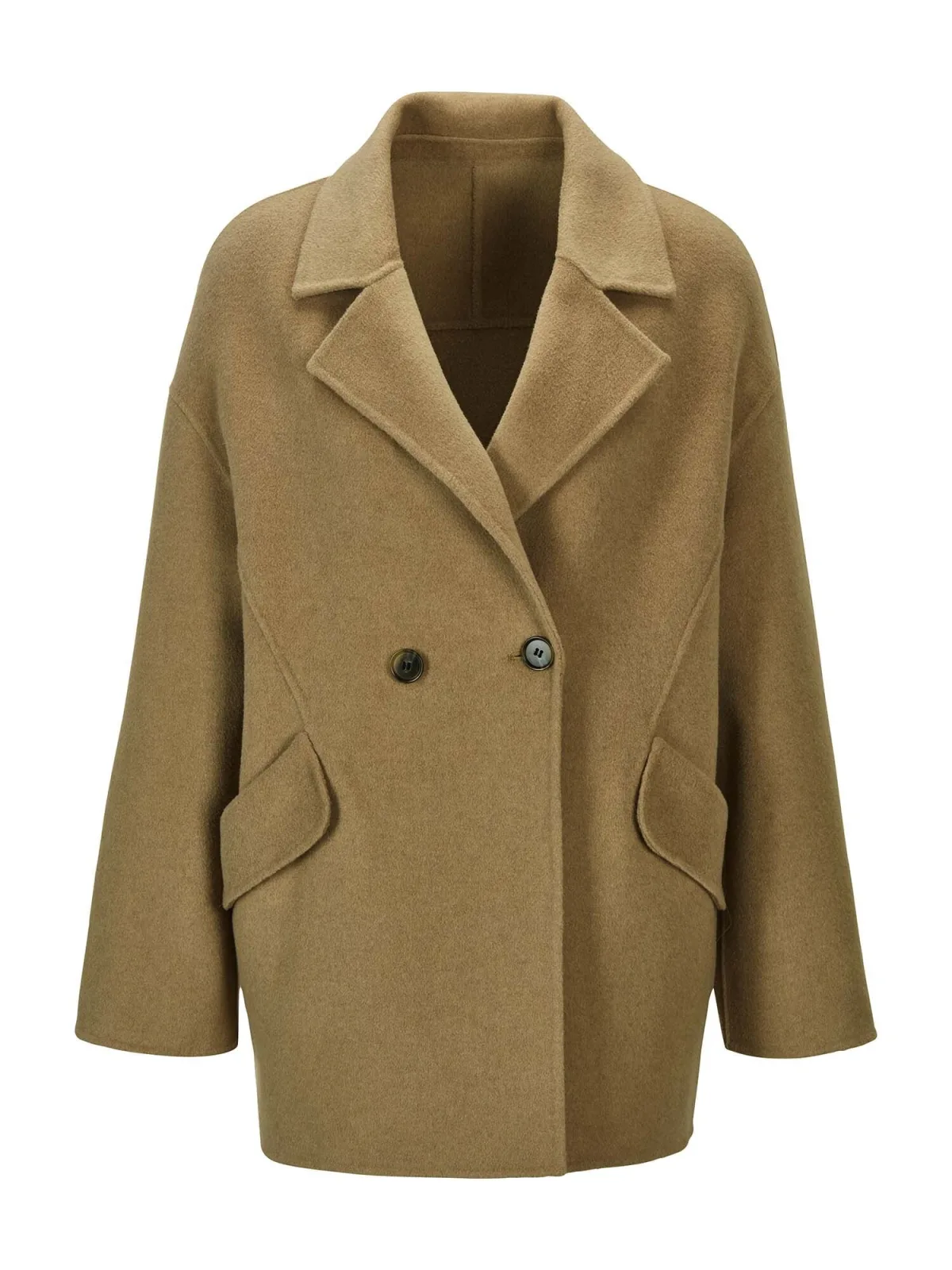 Type mantel: Klassieke mantel; Design: Revers kraag, Opzet-/flapzak; Type sluiting: Knoopsluiting; Voering: Niet gevoerd; Materiaal: Wol; Motief: Effen; Extra's: Op staal naden; Pasvorm: Losse pasvorm; Lengte: Korte pasvorm