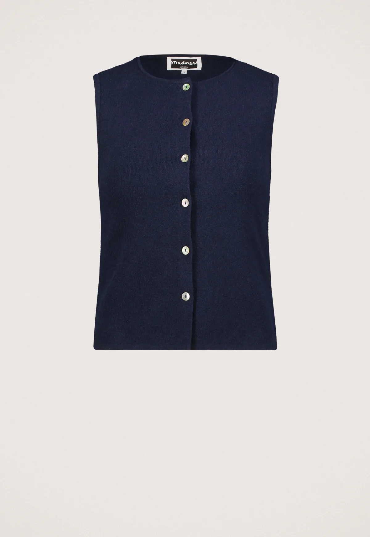 Dit is het Malou Vest van het merk Madness. Dit vest heeft een mouwloos design met een ronde hals en is uitgevoerd met een knoopsluiting aan de voorkant. De fijngebreide kwaliteit in een mix van katoen en polyamide zorgt voor een comfortabele pasvorm.