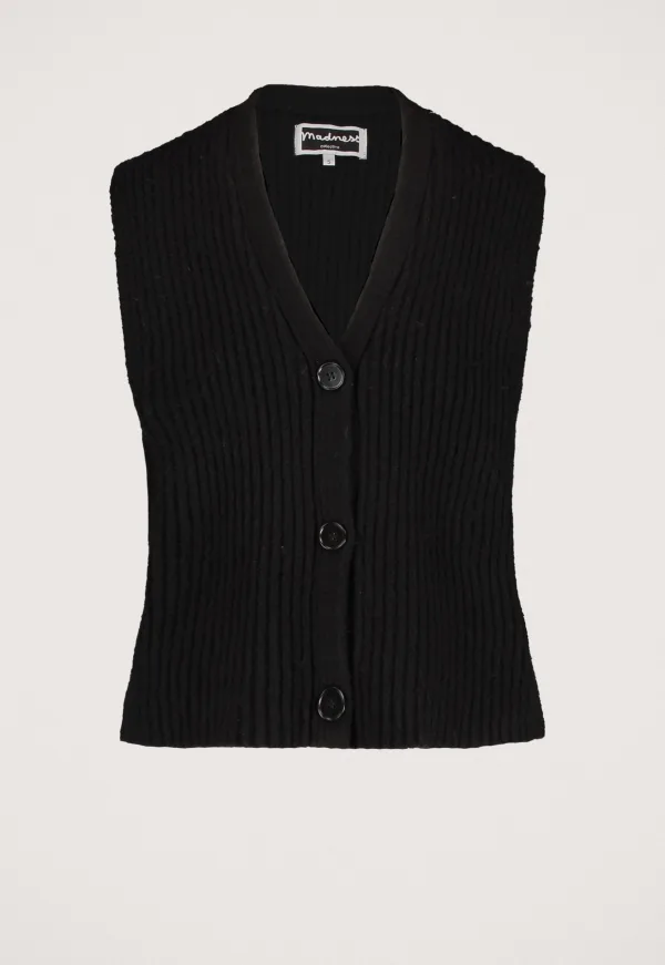 Dit is de Marjolaine Spencer van het merk Madness. Deze Spencer heeft een mouwloze pasvorm en is voorzien van een knoopsluiting.
