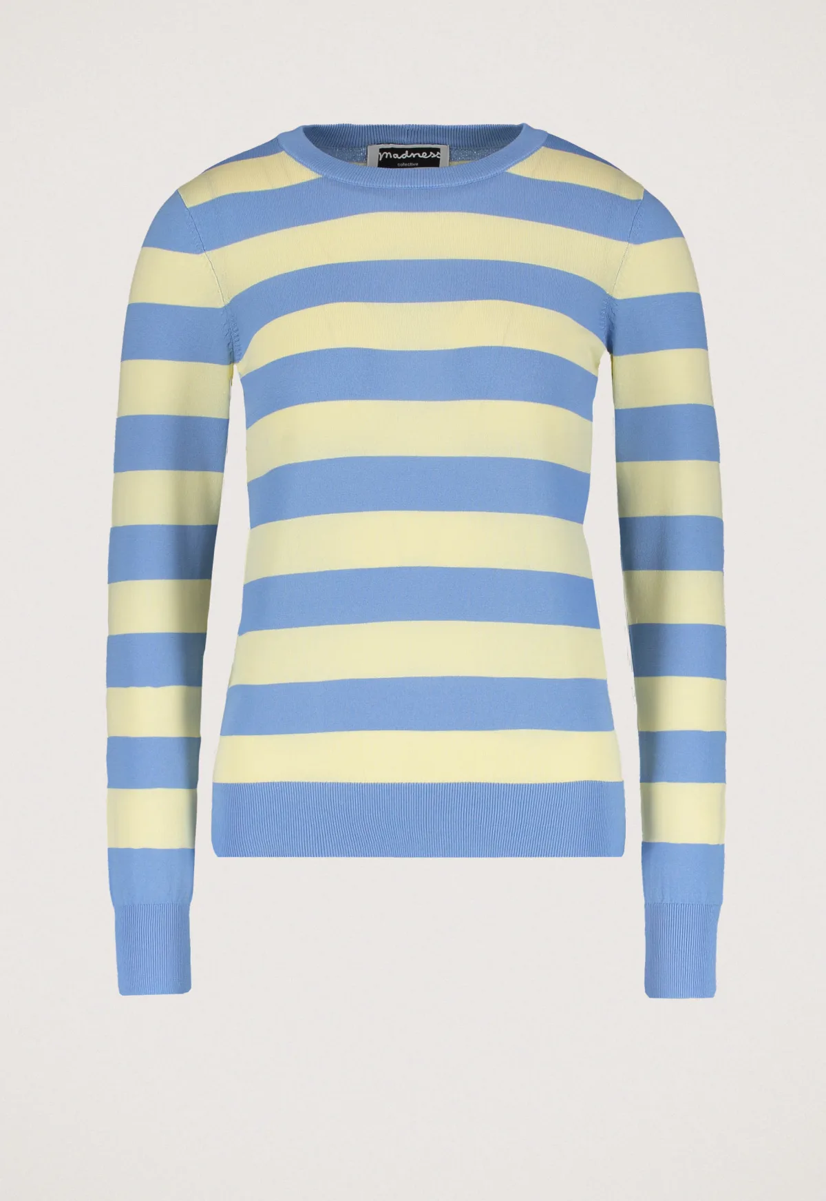 Dit is de Marsela Trui van het merk Madness. Deze Trui heeft een elegante pasvorm die perfect aansluit bij de vrouwelijke vormen. Het materiaal bestaat voornamelijk uit een comfortabele mix van viscose en polyamide, wat zorgt voor een zachte en soepele drapering.