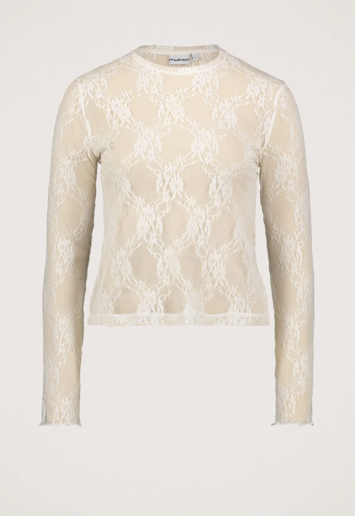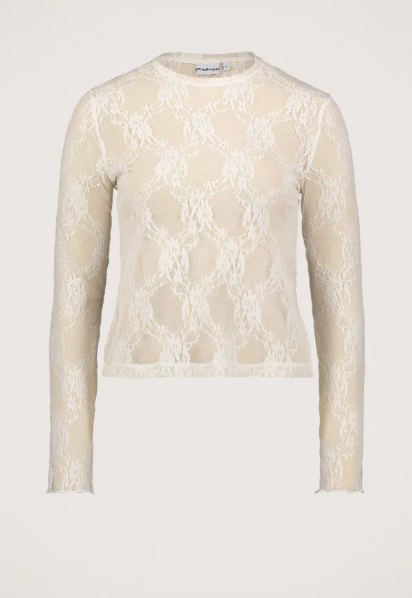 Dit is de Myka Longsleeve van het merk Madness. Deze longsleeve heeft een slim pasvorm, lange mouwen, ronde hals en is gemaakt van een doorschijnende kanten stof.