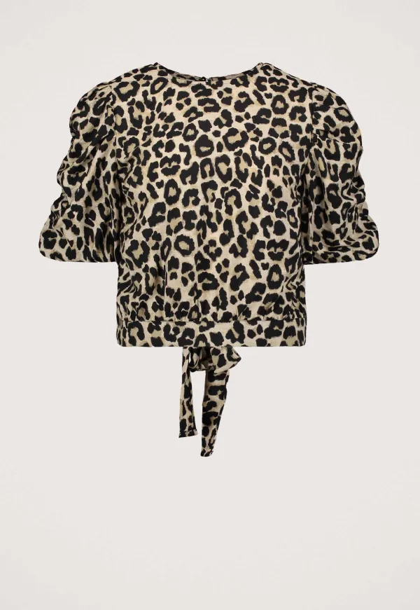 Dit is de Myrilla Blouse van het merk Madness. Deze blouse met panterprint heeft korte pofmouwen met elastische boorden. De open rug met strikband aan de onderkant zorgt voor een echte eye catching look.