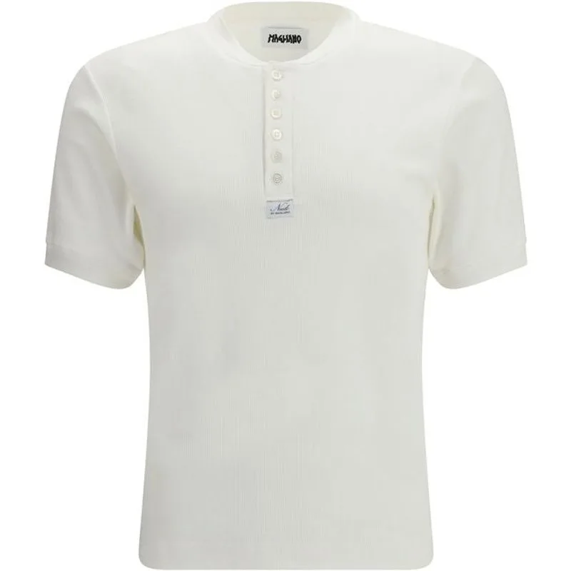 Het Nudo Small serafino T-shirt van Magliano is vervaardigd uit geribd katoenjersey. Deze stijl met korte mouwen heeft een strak ontwerp met een geribde textuur die het karakter van de stof benadrukt, wat zorgt voor een hedendaagse en onderscheidende uitstraling. Seizoen: SS26 Pasvorm: Regular Samenstelling: 93% Katoen 7% Elastaan