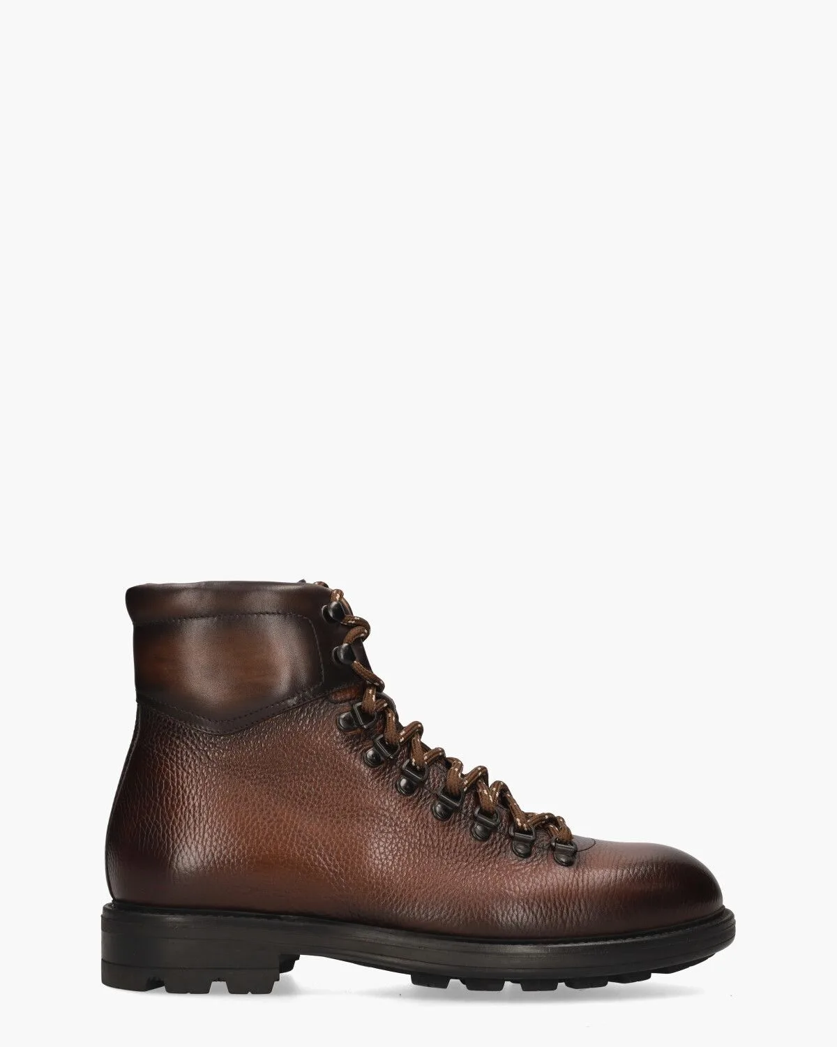 Veterboots in hikingstijl voor heren van het Spaanse merk Magnanni. Deze handgemaakte schoenen 25407 hebben een bovenwerk van gevlamd bruin leer met een grove structuur. Het padded enkelstuk is in glad leder uitgevoerd. De binnenzijde is ook van leer gemaakt en voorzien van een vast voetbed. De schacht is ongeveer 15 cm hoog. De zool is