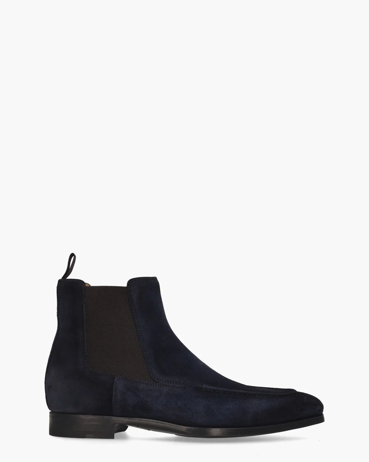 Enkellaars voor heren 25474 van het Spaanse merk Magnanni. Deze donkerblauwe herenschoen in een klassiek Chelsea-model heeft een zacht suède upper en is aan de binnenzijde van soepel leer gemaakt. De opgestikte rand op de voorvoet en de carréneus maken de Chelsea's extra stijlvol. De circa 15 cm hoge schacht is aan beide kanten afgewerkt met