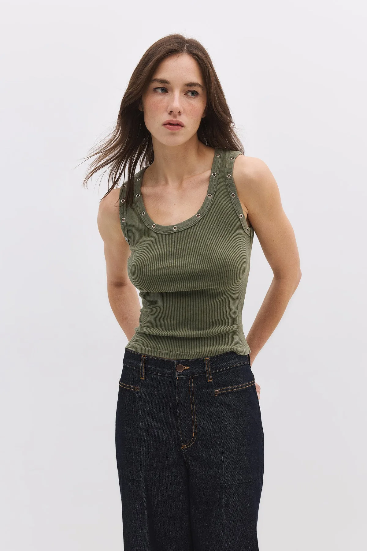 Design: Gevoerde zoom/rand, Geribbelde kraag; Materiaal: Jersey; Halstype: Ronde hals; Motief: Effen; Soort bandjes: Brede bandjes; Extra's: Op staal naden, Met textuur, Metalen oogjes; Pasvorm: Slanke pasvorm; Armlengte: Mouwloos; Lengte: Normale lengte