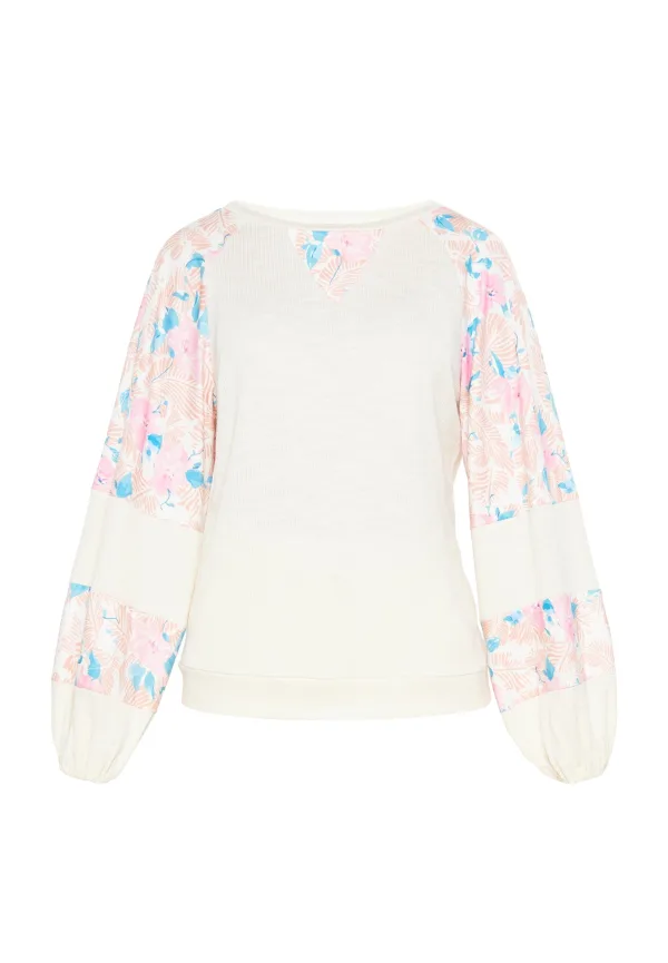 Blouse type: Blouseshirt; Design: Raglanmouwen; Materiaal: Jersey; Halstype: Ronde hals; Motief: Bloemenprint; Kraag: Zonder kraag; Details: Gedrapeerd; Extra's: Met textuur; Pasvorm: Normale pasvorm; Armlengte: Lange mouw; Lengte: Normale lengte