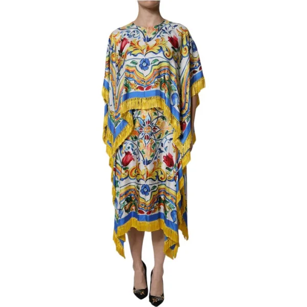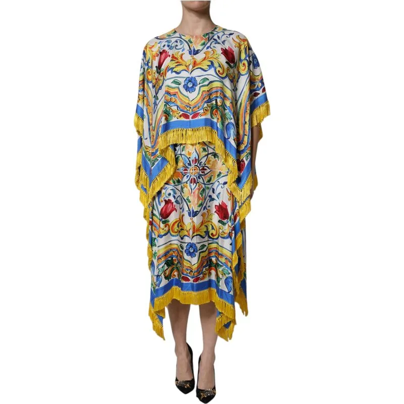 Stap uit, val op en steel de show. Deze Dolce & Gabbana jurk biedt ongeëvenaarde luxe en een blikvanger stijl. De levendige majolica-print transformeert dit stuk in een draagbaar kunstwerk, zodat je overal een statement maakt. De franjes aan de onderkant voegen speelse elegantie toe, met beweging en flair. Geniet van de ontspannen pasvorm en de midi-lengte die samen zorgen voor moeiteloze chic. Ervaar het vertrouwen dat komt met het dragen van een werkelijk uitzonderlijk ontwerp. Perfect voor zonovergoten uitjes of glamoureuze avonden.