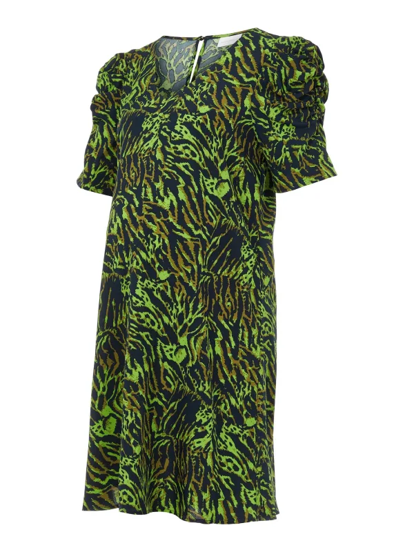 Design: Rechte zoom, Keyholesluiting, Pofmouwen, Diepe snit/decolleté; Halstype: V-hals; Motief: Dierenprint; Details: Cut-outs, Gedrapeerd; Extra's: All-over patroon, Lichte stof; Borstvoedingsfunctie: Zonder borstvoedingsfunctie; Lengte: Knielengte; Pasvorm: Losse pasvorm; Armlengte: Halve mouw