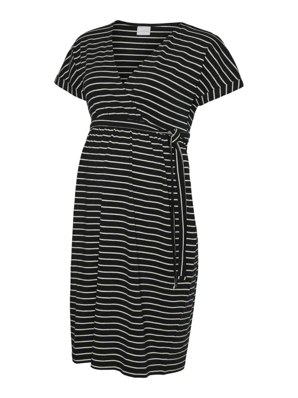 Design: Gevoerde zoom/rand, Mouw revers, Rechte zoom, Diepe snit/decolleté, Tailleriem; Materiaal: Jersey; Halstype: V-hals; Motief: Gestreept; Details: Gedrapeerd, Wikkel design; Extra's: All-over patroon, Voelt zacht aan; Borstvoedingsfunctie: Met borstvoedingsfunctie; Lengte: Knielengte; Snit: Getailleerd; Pasvorm: Normale pasvorm; Armlengte: Kwartmouw