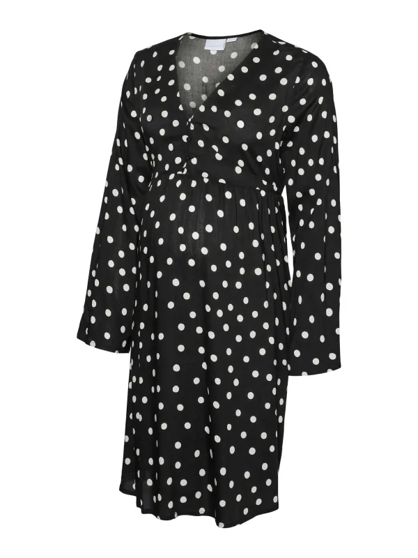 Design: Gevoerde zoom/rand, Rechte zoom; Type sluiting: Knoopsluiting; Materiaal: Viscose; Halstype: V-hals; Motief: Gestippeld; Kraag: Zonder kraag; Details: Gedrapeerd; Extra's: All-over patroon, Gladde stof; Borstvoedingsfunctie: Met borstvoedingsfunctie; Lengte: Knielengte; Snit: Getailleerd; Pasvorm: Normale pasvorm; Armlengte: Lange mouw