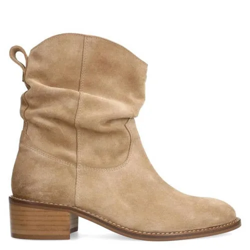 Manfield – Dames – Beige suède enkellaarsjes met hak – Prijzen