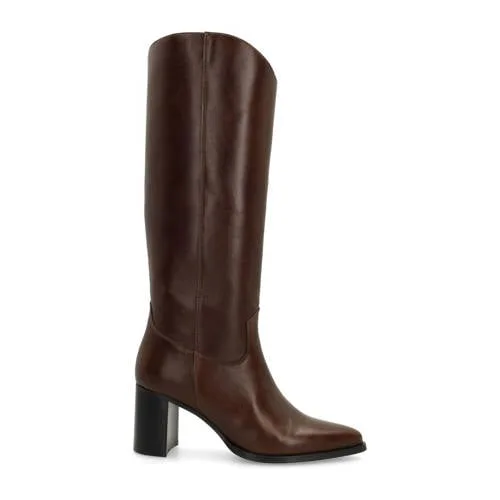 Manfield - Dames - Donkerbruine hoge leren laarzen met hak...
