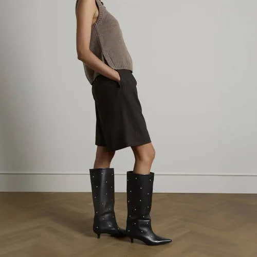 Deze hoge laars is van Manfield en gemaakt van leer. De voering is ook van leer. Met studs als detail en een kitten heel loop je er stijlvol bij.