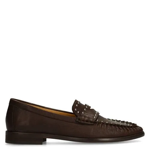 Manfield Dames Bruine leren loafers met zilverkleurige studs