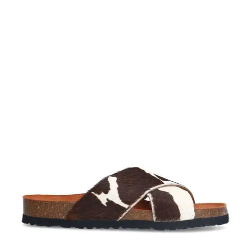 Manfield leren slippers met koeienprint wit/bruin Prijzen